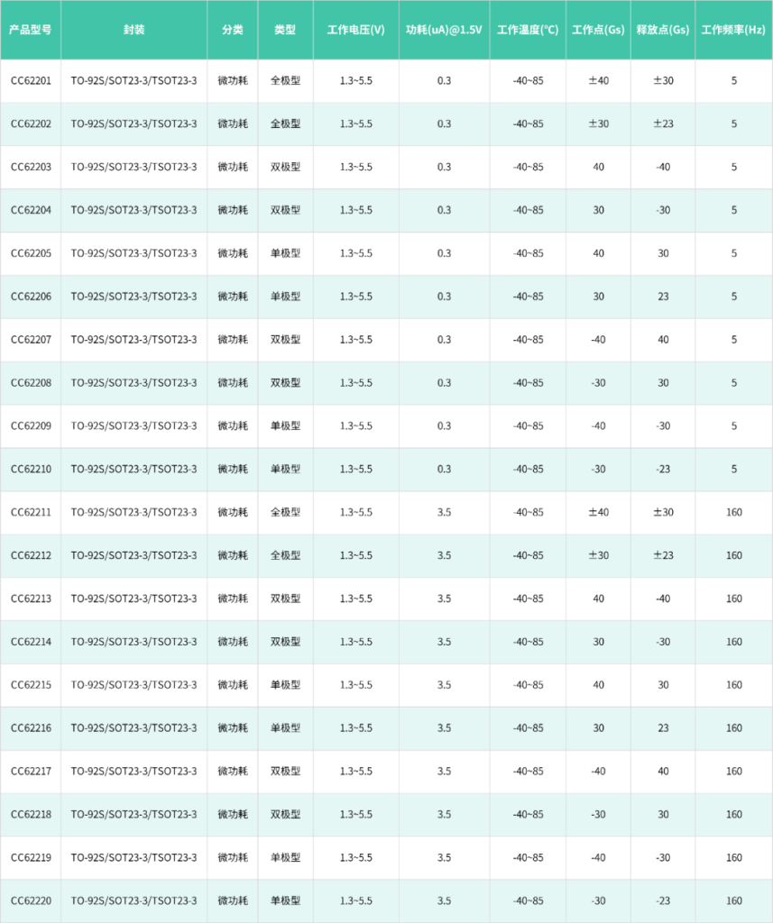 Серия CC622XX включает в себя низковольтные датчики Холла с ультранизким энергопотреблением, отличающиеся высокой чувствительностью к магнитному полю. Эти микросхемы предлагают несколько пороговых значений магнитного поля, частот переключения и вариантов корпусов для различных применений. Разработанные специально для систем с ограниченным пространством и устройств, чувствительных к энергопотреблению батарей, они особенно хорошо подходят для портативной электроники, питающейся от батарей, такой как мобильные телефоны, беспроводные телефоны, ноутбуки и КПК.